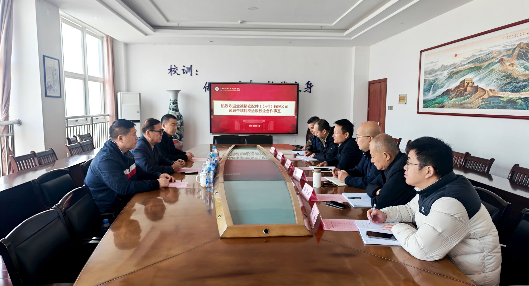 12月4日,金德精密配件(苏州)有限公司总经理武英战一行莅临我校回访,就深层次校企合作事宜展开专项洽谈。学校党委副书记、院长游振磊,副院长彭明及相关部门负责人出席座谈会,双方围绕人才培养、实习就业、产教融合等核心议题深入交流。