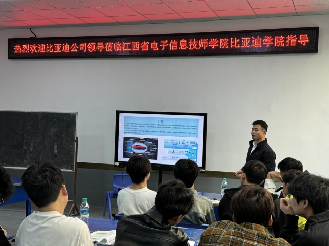 为促进产教融合,深化校企合作,4月8日上午,学校邀请比亚迪汽车售后服务事业部南昌大区技术督导罗敏志、技术巡检工程师李冬冬来校开展“精诚讲堂”活动。24级比亚迪精诚英才项目班学生及新能源汽车专业授课教师参加。