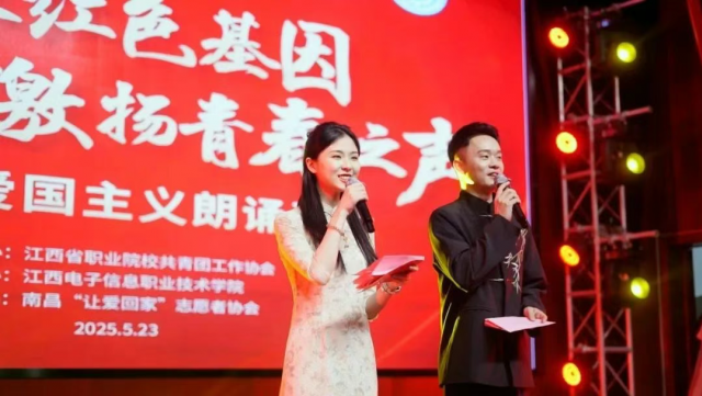 为深入学习贯彻党的二十届三中全会精神,庆祝中华人民共和国成立76周年、抗日战争胜利80周年及红军长征胜利90周年,5月23日下午,由江西省职业院校共青团工作协会主办、江西电子信息职业技术学院承办、南昌“让爱回家”志愿者协会协办的“传承红色基因激扬青春之声”多校共建爱国主义朗诵诗会在江西电子信息职业技术学院学术报告厅隆重举行。多所职业院校团委师生代表400余人齐聚一堂,共同见证这场红色文化盛会。