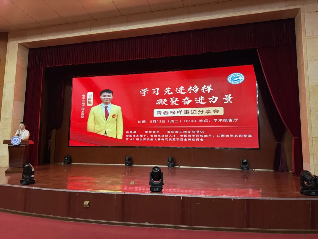 本次大会特邀我校电子应用工程系党员教师、第45届世界技能大赛电气装置项目金牌获得者、全国技术能手、江西青年五四奖章获得者肖星星老师进行榜样分享。会上,肖星星老师以“奋斗是青春最亮丽的底色”为信念,围绕“希望”“成长”“荣誉”“幸运”四个关键词,声情并茂地分享了自己从中职学生逆袭为世赛冠军的奋斗历程。他用亲身经历告诉同学们,每一个拼搏的日子都闪闪发光,每一段难忘的记忆都温润人心。他号召全体同学要勇攀高峰,提升专业技能、展现青春风采、实现青春价值,用奋斗书写属于自己的青春华章。