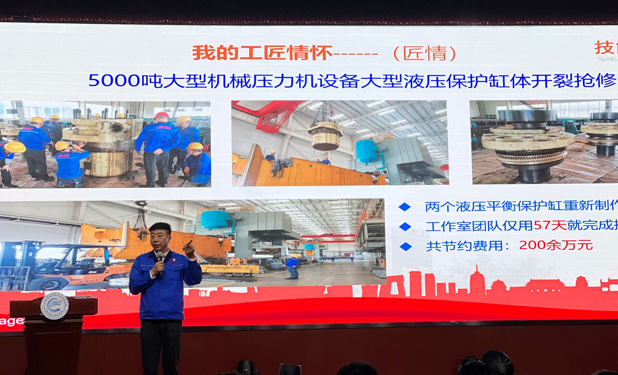 他讲述了攻克5000吨大型机械压力机抢修、跨专业解决设备故障等技术难题的经历,诠释了自己心中“敬业、精益、专注、创新”的劳模工匠精神;分享了通过“名师带徒”机制培养122名高技能人才,带领工作室斩获3项国家发明专利、119项市级以上荣誉的实践成果,彰显传帮带的责任担当。