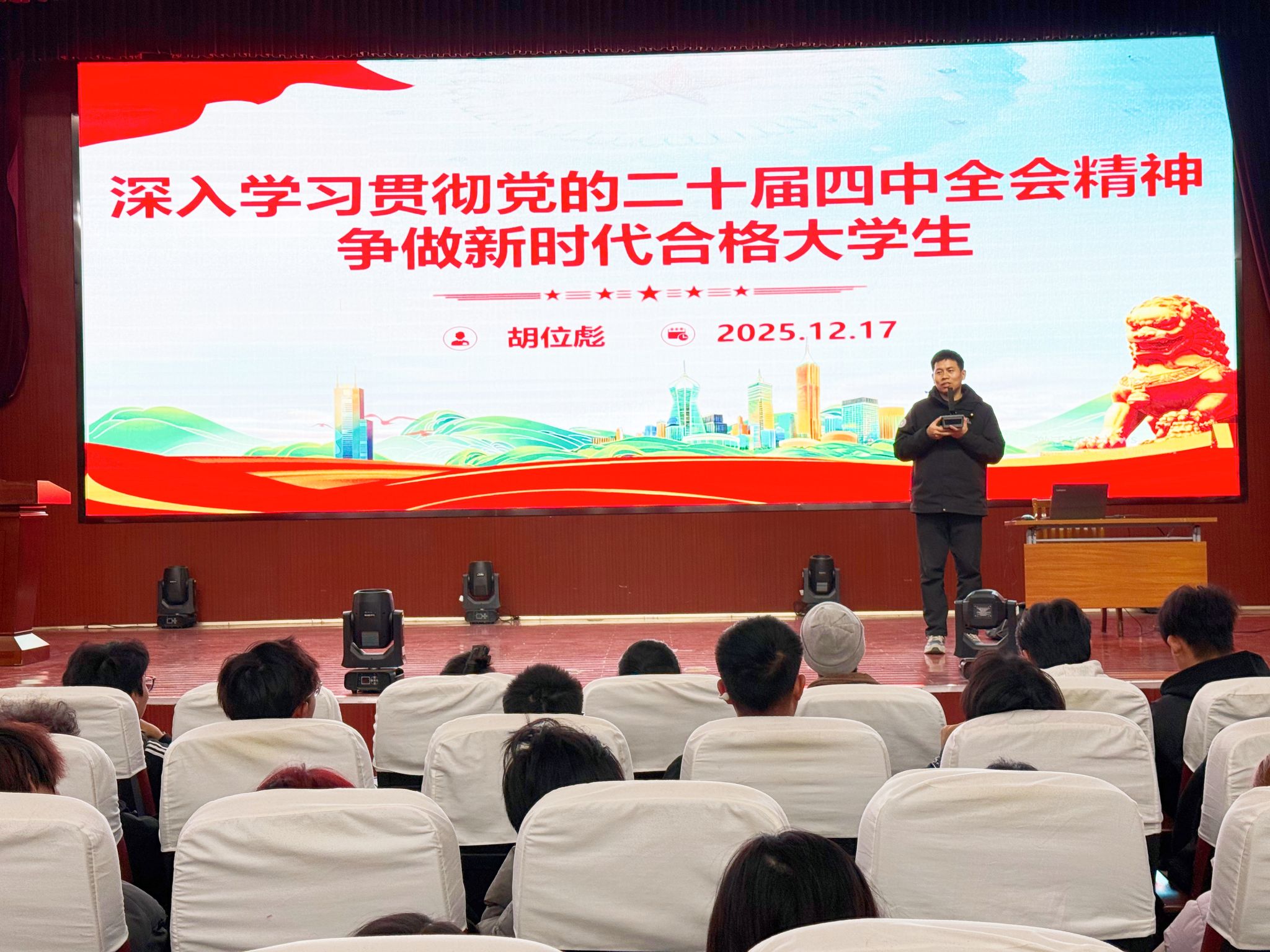 12月17日晚,文化创意学院党支部书记利用晚自习时间,面向学院高职学生组织开展党的二十届四中全会精神专题宣讲活动,主题为“深入学习贯彻党的二十届四中全会精神,争做新时代合格大学生”。