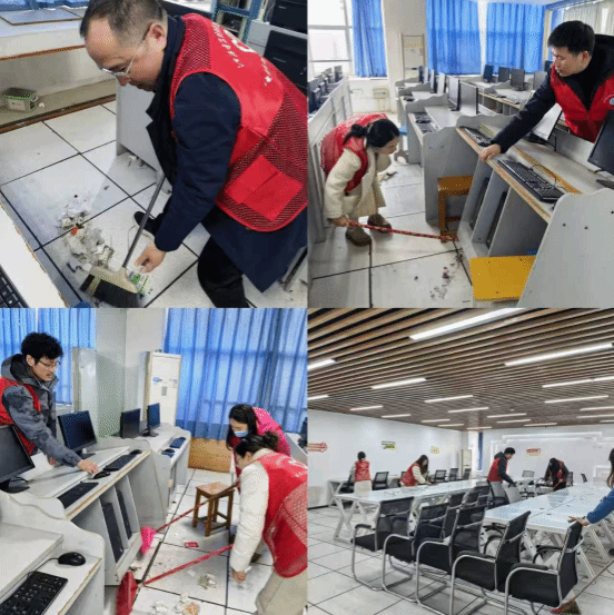 活动现场,身穿红马甲的志愿者们准时在科技楼集合。按照预先分工,10个小组迅速奔赴各机房,严格按照“先上后下、先里后外”的操作流程,对机房展开深度清洁。大家俯身仔细擦拭显示器、键盘等设备,清理键盘缝隙杂物;合力移开桌椅后,对地面、桌洞及墙角死角进行全面清扫,并细心检查电源线路、排除安全隐患。党员们还发挥专业优势,顺便检查电脑运行状况,对设施设备进行基础养护,实现了专业技能与劳动实践的结合。在大家的共同努力下,10间机房焕然一新、窗明几净。此次活动不仅为师生创造了整洁的教学环境,更让志愿者们在挥洒汗水中锤炼了党性修养,深刻体悟了劳动与奉献的价值。
