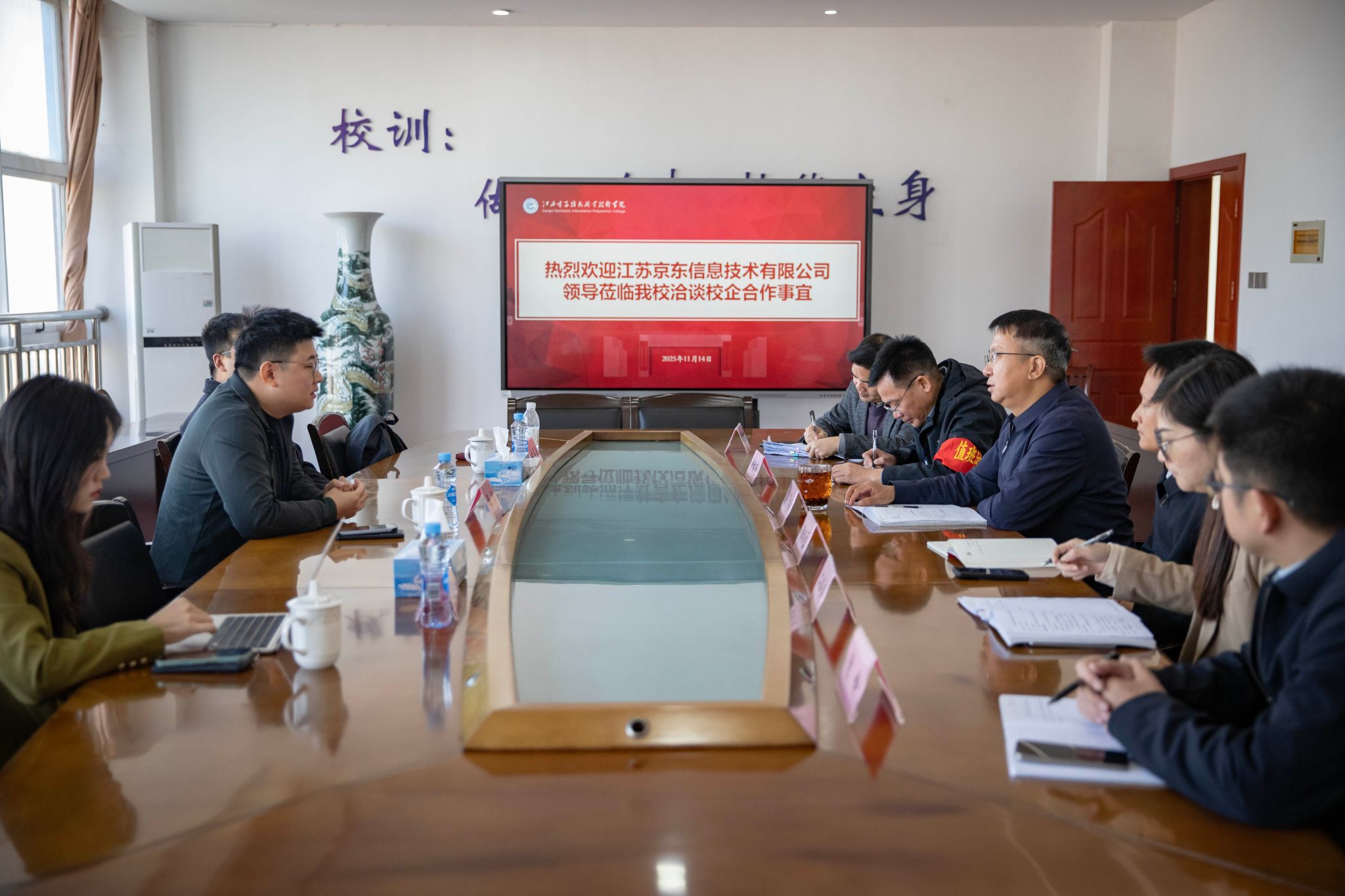 11月14日,京东集团校企合作部杨阳一行来访我校,双方围绕深化校企协同育人、推进产教融合高质量发展举行专题座谈会。校党委书记肖红秋,党委副书记、院长游振磊、党委委员、副院长钟端玮及相关部门负责同志出席座谈。