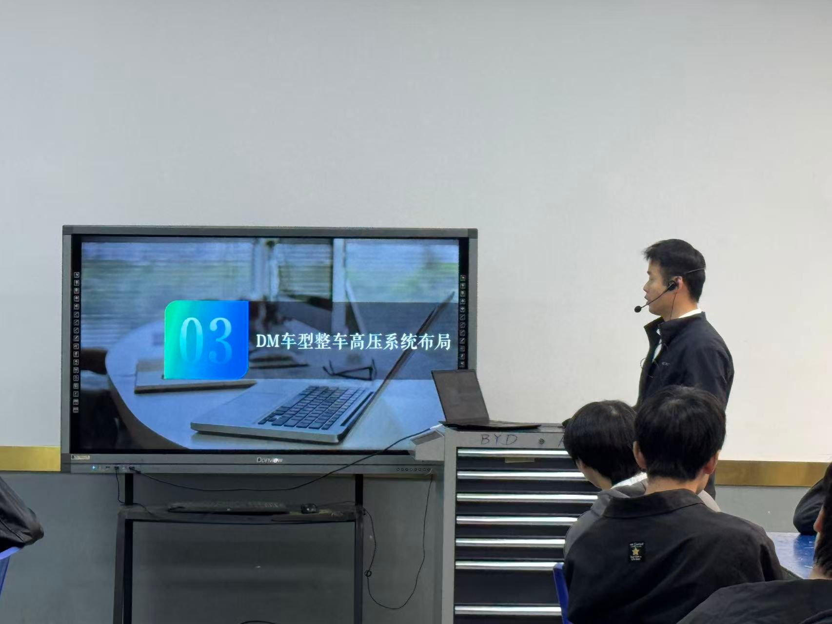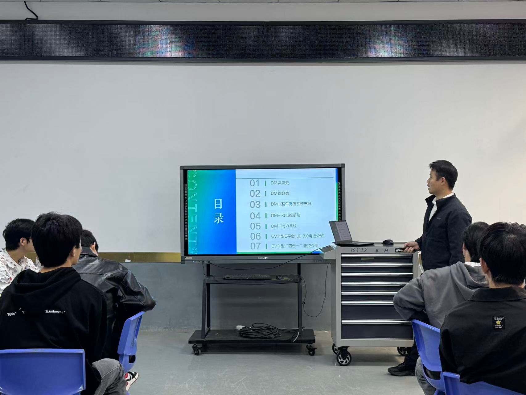 课堂上,李冬冬工程师充分展现出扎实的专业功底和丰富的实践经验。他以比亚迪DM发展史及分类为切入点,生动讲述了比亚迪混动技术在不同阶段的发展特点与创新突破,让同学们对比亚迪混动技术的演变有了清晰脉络。接着,他深入到DM-i整车高压系统布局,细致讲解了各个部件的功能和相互协作原理,使学生们对高压系统有了更为直观和深刻的认识。