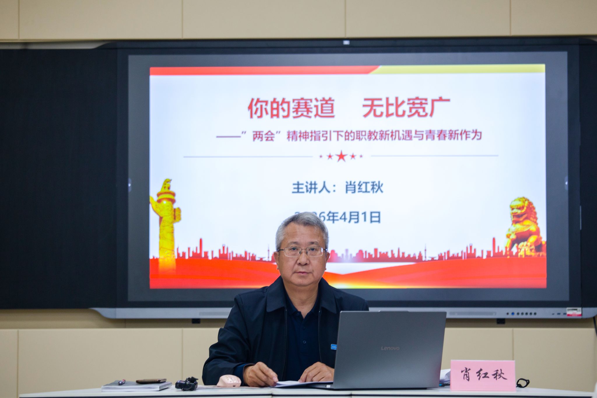 肖红秋以“你的赛道 无比宽广——两会精神指引下的职教新机遇与青春新作为”为题,紧扣2026年全国两会精神,围绕教育、科技、技能人才培养等方面出发,系统解读职业院校办学体系完善、育人模式改革、产教融合深化及复合型高技能人才培育等发展路径部署,深刻阐明职业教育在服务新质生产力、推动产业升级、促进就业增收中的重要作用。他指出,两会为职业教育高质量发展注入强劲动力,当前职业教育正迎来政策赋能、产教融合、人才成长三大新机遇,学校将以两会精神为指引,锚定办学定位,深化内涵建设,全力打造特色鲜明、优势突出的高水平职业院校。